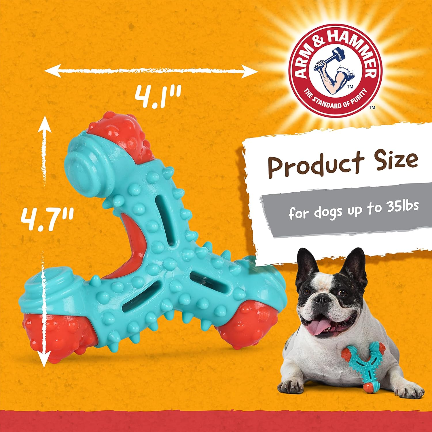 The Arm & Hammer Wishbone Dental Toy for Dogs is the ideal dog dental toy to turn destructive behavior into productive, positive playtime. Infused with baking soda to naturally eliminate odors, this dog toy is made with Nylon & TPR for durability. It is a great dog toy for light to medium chewers. The nubs and grooves help clean teeth without a toothbrush. Plus, dogs love the delicious chicken flavor. Dogs enjoy chewing their way to better dental health with the Arm & Hammer Wishbone Toy. This dog dental toy is a great way to reward your dog with a dog toy that keeps on giving. It turns chewing into positive playtime while helping clean your dog’s teeth. This dog chew dental tool helps remove plaque and tartar from your dog’s teeth as dogs chew. As with all dental tools for dogs, when selecting your Arm & Hammer chew toy, it is important to select the proper size and chew toy for your dog’s age, chew strength, and weight. As with all dog chew toys, please supervise use and remove all separate parts. Pet parents can also look into our Arm & Hammer dog toothpastes and dog dental care kits for more dog oral care and dog oral hygiene solutions. All products come with Arm & Hammer baking soda as a key ingredient to help naturally deodorize and freshen breath. Dog toothbrushes come in multiple sizes and varieties for all dogs, both large and small. Arm & Hammer also makes dog dental treats like nubbies dog dental treats, treadz dog dental treats, dog dental chews, rawhide free dog treats, fruit twister dog treats, and more! Be sure to check out our full collection.